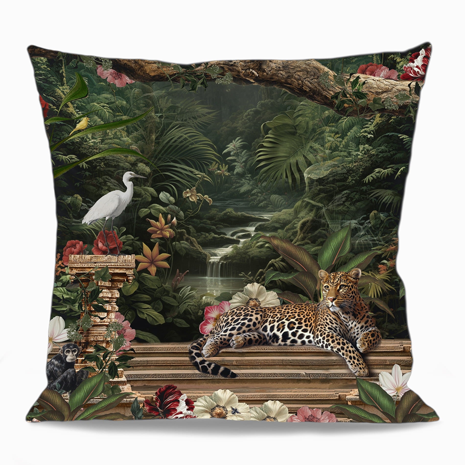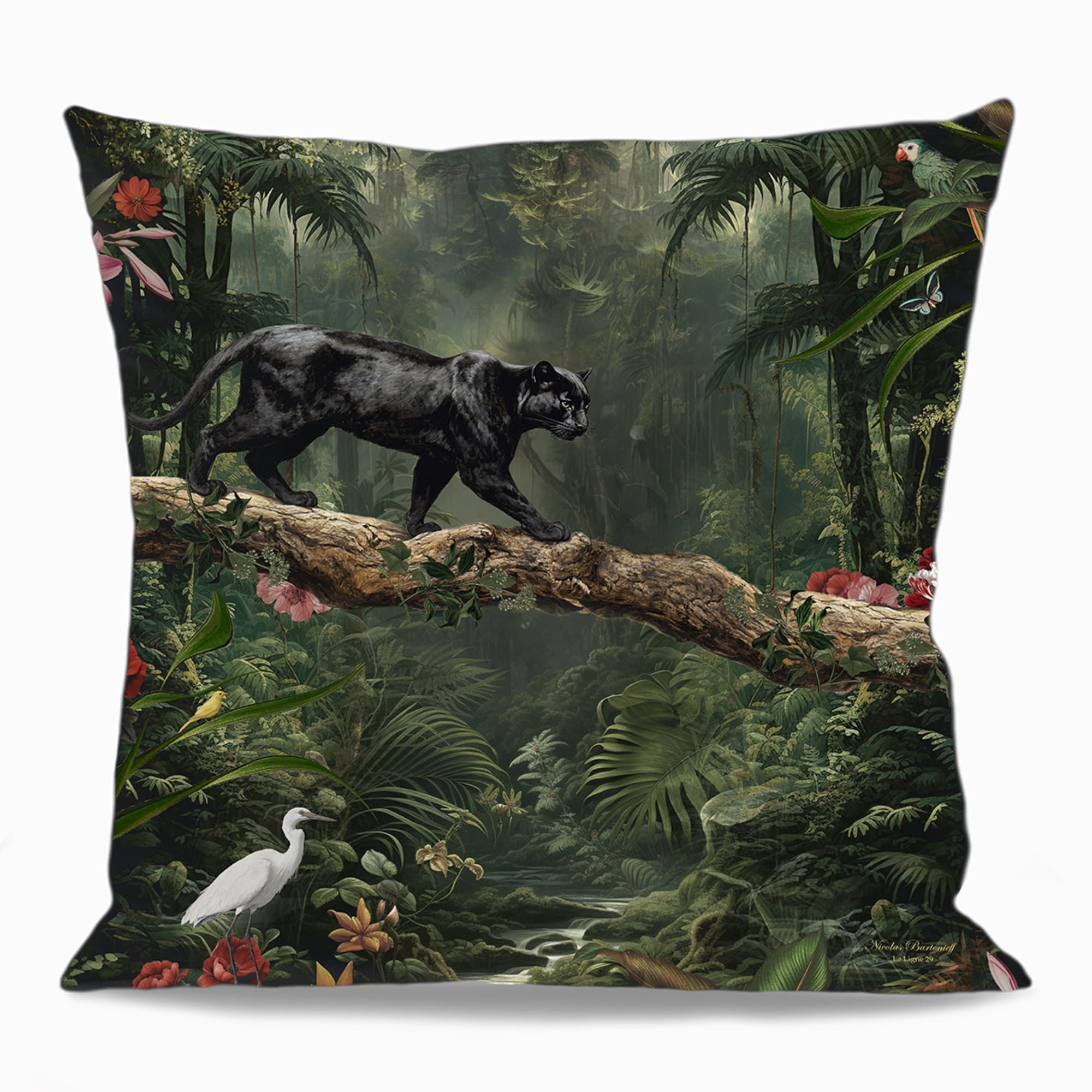 At the heart of the composition emerges a majestic jaguar - symbol of confidence, agility, and quiet power. Set within a lush and dreamlike atmosphere, the feline’s piercing gaze and fluid silhouette convey both intensity and grace. The depth of the colors and the refinement of the details bring the scene to life, transforming this cushion cover into a bold and one-of-a-kind element for your interior.